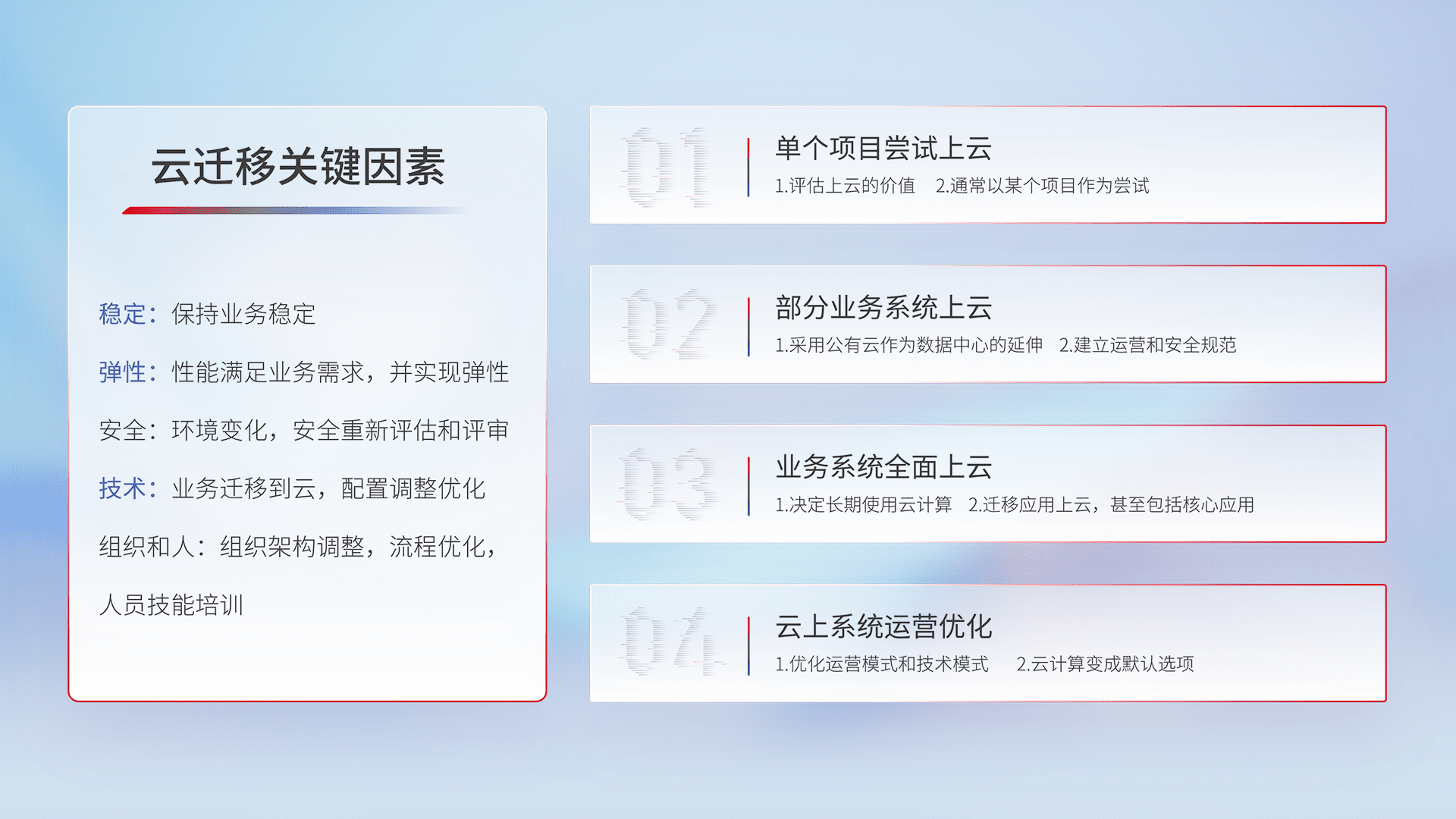 结合实际业务,,从规划设计、、、、云平台选型、、云原生改造、、数据迁移、、集成交付,,迁移全过程为客户识别最佳上云路径,,,做好风险识别管理,,,设计网络架构、、身份权限、、安全审计合规、、、、操作审计、、日志审计、、、监控告警策略、、、、多站点容灾设计等,,对云上基础设施进行整体规划,,,提升IT治理水平,,以满足弹性、、高可用、、、高性能的需求。。。