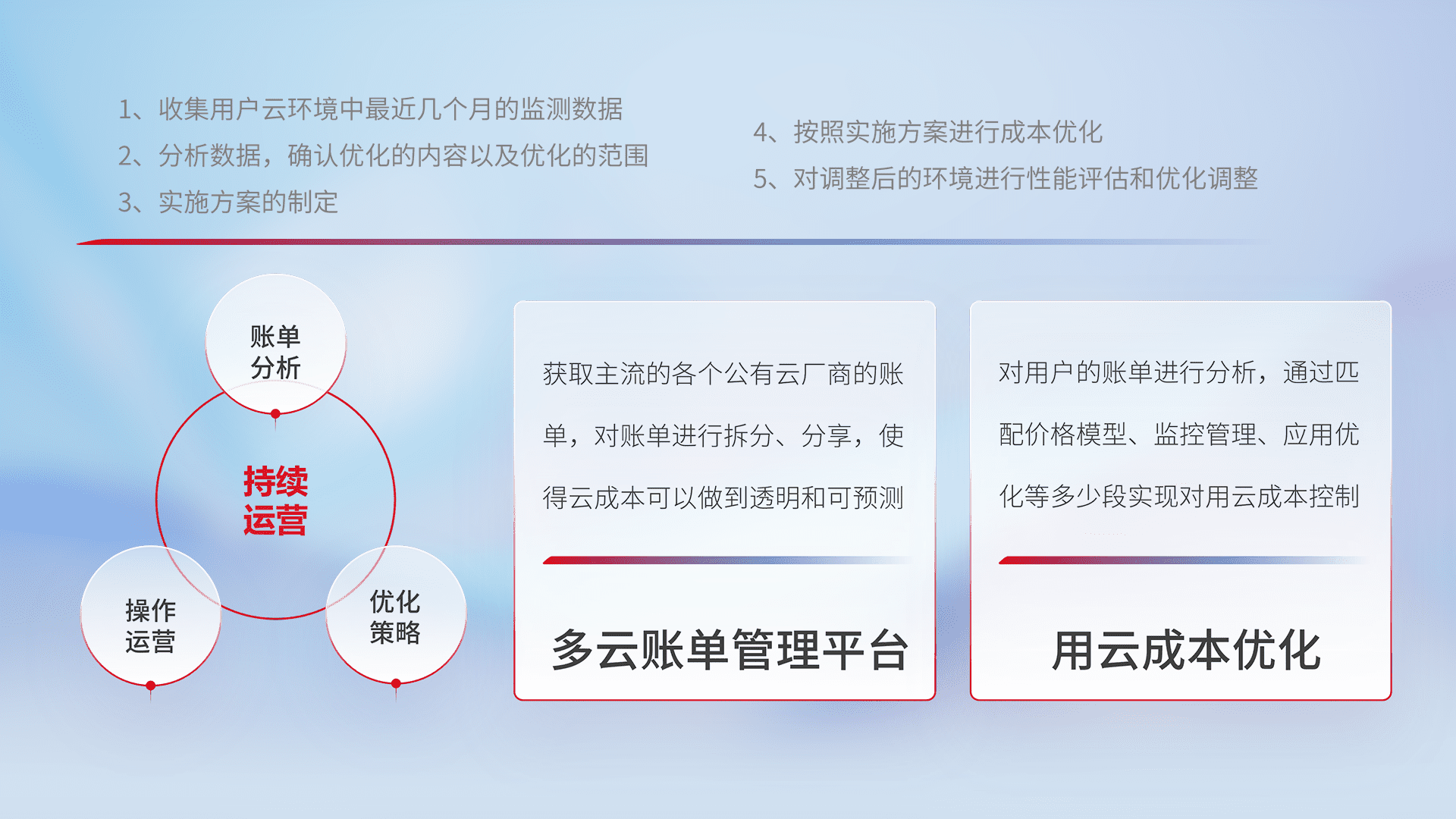 通过多云纳管,,以统一的资源数据模型把客户的云资源进行抽象和封装,,进而实现对多云资源的统一操作,,,保障云资源管理的可靠性、、稳定性与可用性。。。。量身定制化运维内容,,,,配置、、开发运维、、、补丁管理、、、备份、、监控、、、、认证和访问管理、、、审计和日常巡检等,,,保障在用云过程中的可靠度,,,稳定度以及高可用率。。。。